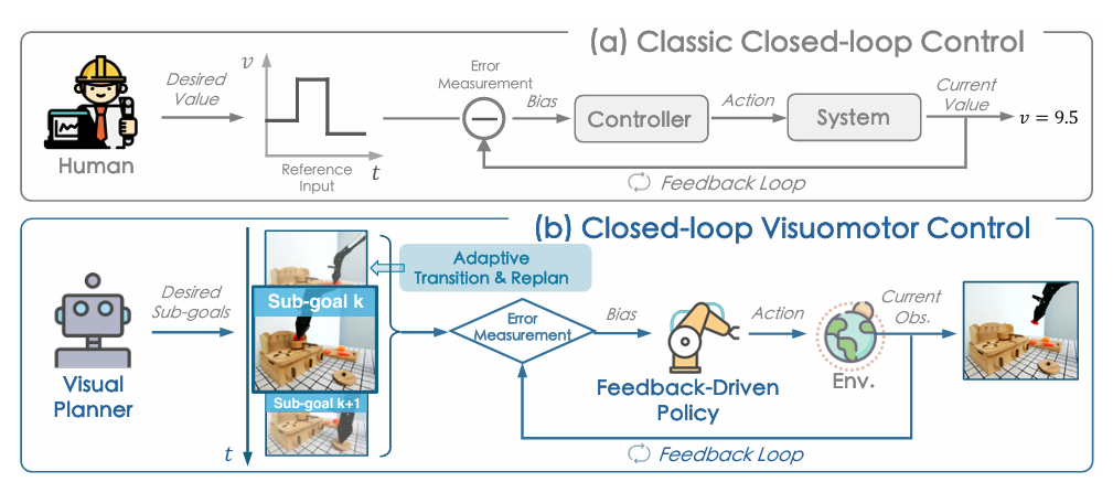 论文内容:尽管近年来机器人学和具身AI取得了显著进展,但将机器人部署用于长时域任务仍然是一个巨大挑战。大多数先前的技术采用开环理念,缺乏实时反馈,导致误差累积和不理想的鲁棒性。少数方法尝试利用像素级差异或预训练视觉表示建立反馈机制,但其效果和适应性受到限制。受经典闭环控制系统启发,CLOVER框架包含三个核心组件:文本条件视频扩散模型生成视觉计划作为参考输入,为机器人提供未来状态的视觉子目标;可测量嵌入空间用于准确的错误量化,通过测量连续帧之间的距离来检测不可达的计划;反馈驱动控制器根据反馈改进动作并在需要时启动重新规划。由于闭环属性,CLOVER对视觉干扰和对象变化具有鲁棒性,在子目标不可行时自动重新规划,达到目标时适应下一个目标。该框架在仿真和真实机器人任务中都验证了有效性,在CALVIN基准上达到最先进性能,比之前的开环对应方法提升8%,真实世界长时域操作中完成任务的平均长度提升91%。