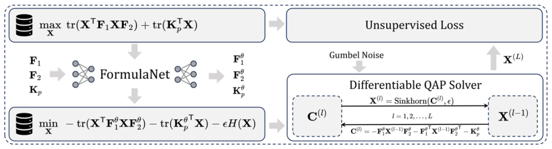 论文内容:二次分配问题(QAP)因其广泛应用和计算挑战而持续受到关注。尽管机器学习在QAP领域有着丰富的文献,但大多数工作通常在图像匹配的设置下解决问题,其中深度网络在提取有用特征方面发挥重要作用。然而,它们在纯数值QAP实例上的能力仅限于节点嵌入,通常使用普通的图神经网络。因此论文开发了一个双层无监督框架,具体包括:(1)内层优化:尝试通过熵正则化求解修改后的实例,可使用Sinkhorn算法迭代求解,而不会通过在训练期间截断梯度来影响反向传播;(2)外层优化:处理原始QAP的二次目标函数。