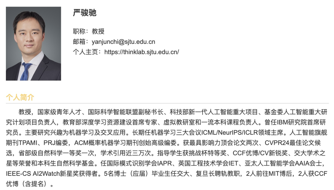 严骏驰教授,上海交通大学人工智能学院教授,IAPR/IET Fellow,CCF优博/杰出会员。科技部2030新一代人工智能重大项目负责人、国家自然科学基金委优青、交叉学部重大研究计划重点项目负责人、教育部资源建设深度学习首席专家。发表CCF-A类第一/通讯作者论文过200篇(CVPR24最佳论文候选、AAAI21最具影响力论文),引用超21000次。