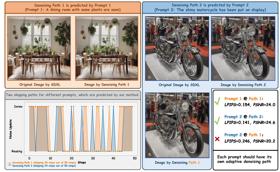 论文内容:扩散模型最近在高质量图像和视频合成方面取得了巨大成功。然而,扩散模型中现有的去噪技术通常基于逐步噪声预测,这导致高计算成本,对交互式应用造成了令人望而却步的延迟。该方法考虑在保持最终去噪结果与原始完整步骤相同的情况下尽可能跳过更多噪声预测步骤的潜力。跳跃策略由三阶潜在差分指导,该差分指示去噪过程中时间步之间的稳定性,包含三阶潜在差分估计器来确定是否重用来自先前时间步的噪声预测进行当前时间步的去噪。作者严格分析了跳跃去噪过程中引入的误差,定义并证明了一个定理,建立了依赖于相邻潜在向量之间差异的误差上界。该方法无需训练即可直接在现有预训练扩散模型上应用,基于三阶潜在差分值自适应近似各种提示的最优跳跃策略,为图像和视频生成模型提供统一的跳跃策略。在图像和视频扩散模型上的广泛实验表明,该方法可以显著加速去噪过程,同时生成与原始过程相同的结果,实现高达平均2-5倍的加速而无质量降低,在文本到图像、图像到视频和文本到视频生成任务上都取得了优异性能。