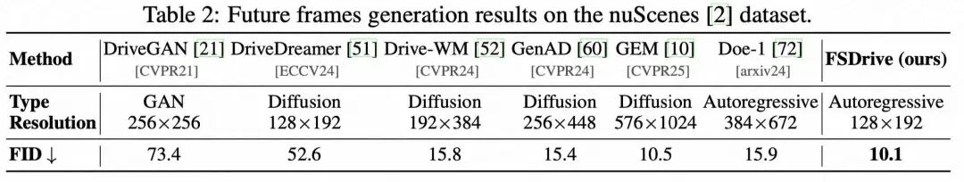 在轨迹规划、未来帧生成和场景理解任务中进行全面评估,验证了FSDrive的有效性。