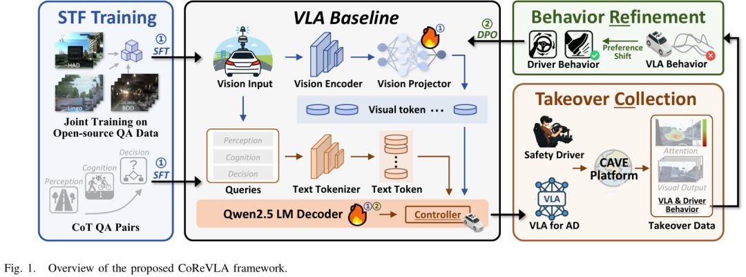 为解决上述问题,CoReVLA提出持续学习的双阶段框架,通过“数据收集(Collect)”与“行为优化(Refine)”循环,提升长尾场景下的决策能力。整体流程如figure 1所示,分为预阶段(SFT)、第一阶段(接管数据收集)、第二阶段(DPO优化)三部分。