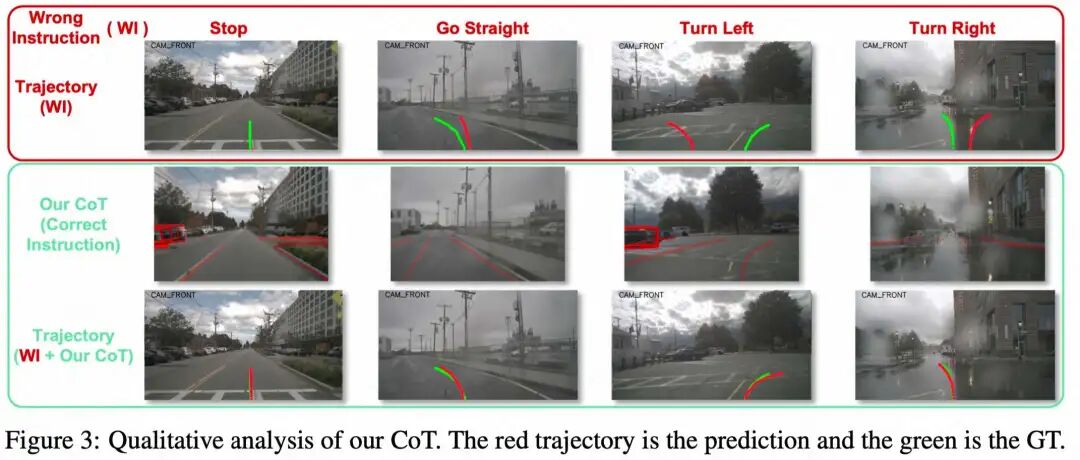 自动驾驶规划需不仅理解当前场景,还需预见未来演变。此过程应模拟物理世界而非纯文本逻辑推理。由于模型已在预训练阶段学习物理约束,且为提高效率,我们不再单独生成车道线、3D检测和未来帧,而是将其整合为统一帧。如图2右部所示,VLM作为世界模型生成预测未来状态的统一图像帧:借鉴视觉提示工程(用红圈引导注意力)和VLIPP(先预测边界框引入物理先验),我们在预测帧中用红色车道线和3D检测框表示未来空间关系。这些粗粒度视觉线索引导模型关注可行驶区域和关键物体,同时施加物理约束。时间关系则由普通未来帧体现,视觉内容的动态演变直观呈现时间进展。随后,时空链式思考作为中间推理步骤,使VLM作为逆动力学模型,基于当前观测和未来预测规划轨迹: