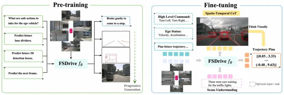 本文提出了FSDrive,一种基于时空CoT的自动驾驶框架,使视觉语言模型(VLMs)能够可视化地思考。通过中间图像形式的推理步骤,将未来场景生成与感知结果统一起来,FSDrive有效消除了跨模态转换带来的语义鸿沟,并建立了端到端的视觉推理流程。该视觉语言模型承担双重角色:作为世界模型,通过车道线分隔线和三维检测预测未来图像帧;同时作为逆动力学模型,基于当前观测和未来预测共同规划行驶轨迹。为实现VLM的视觉生成能力,我们提出了融合视觉生成与理解的预训练范式,并设计了渐进式由易到难地生成制以增强自回归图像生成效果。大量实验结果验证了FSDrive方法的有效性,推动自动驾驶技术迈向视觉推理。