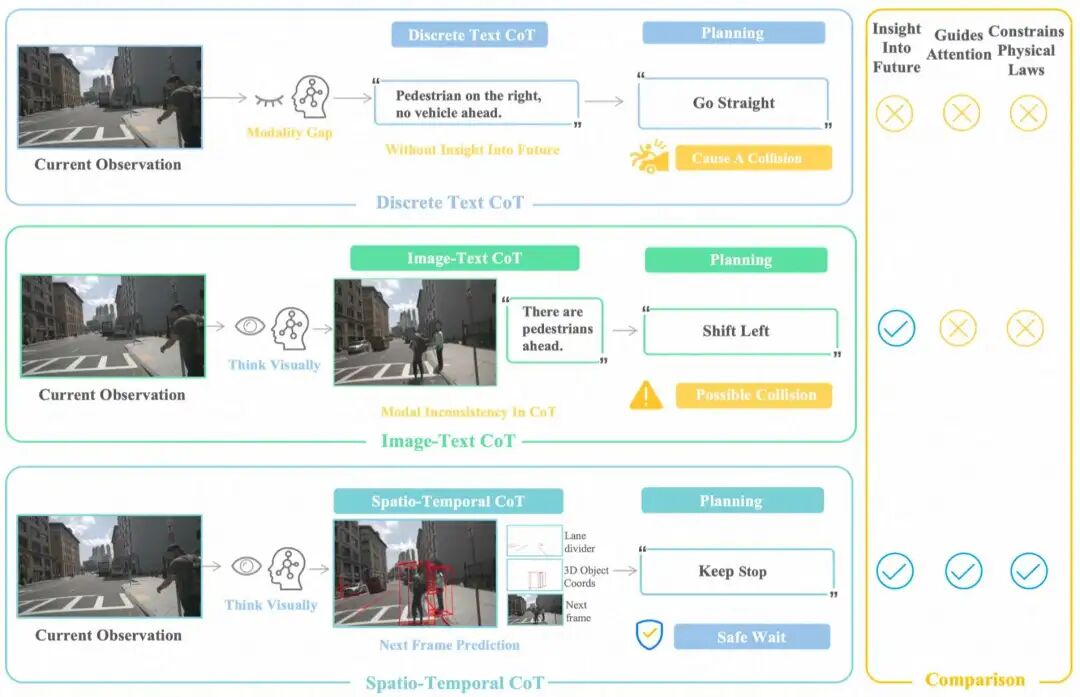 在语言领域,思维链(CoT)通过鼓励逐步推理显著提升了推理能力和可解释性。然而,现有自动驾驶研究通常将离散文本CoT(如针对当前场景的语言描述和边界框坐标)作为中间推理步骤。这种方法本质上是对视觉信息的高度抽象和符号化压缩,可能导致时空关系模糊、细粒度信息丢失以及模态转换鸿沟,如图1顶部所示。对于需要深度物理世界交互的自动驾驶系统而言,其思考过程是否应更接近对世界的模拟和想象,而非单纯依赖语言逻辑推理?