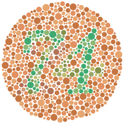 色觉正常的人能清楚地从图中看出数字74,红绿色盲者会看到21,而全色盲者可能看不出数字。
