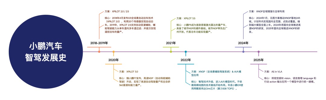 小鹏汽车的自动驾驶发展史是一个从无到有、从有到精、从特定场景到全场景的持续进化过程。其技术路线从早期的多传感器融合与高精地图依赖,逐步转向 “无图”化、端到端大模型驱动的方案。这个过程伴随着硬件算力的大幅提升和算法模型的不断革新。
