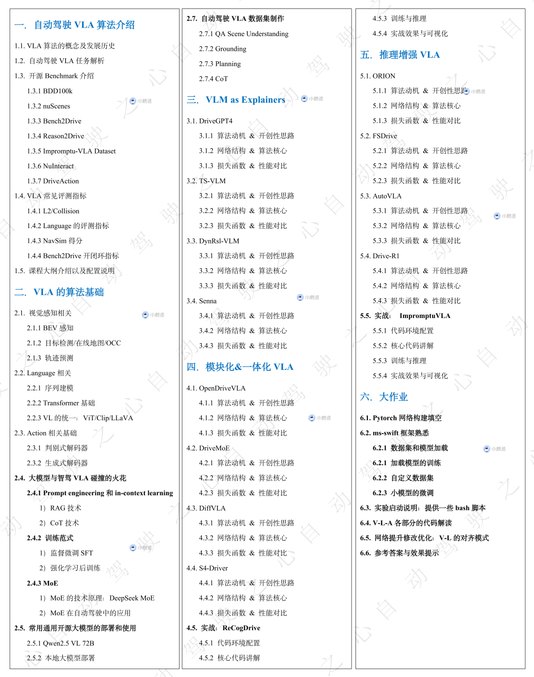 第一章主要是针对自动驾驶VLA概括性的内容讲解,这一章老师会带大家复盘一下VLA算法的概念及发展历史,并带大家拆解一下自动驾驶VLA这个任务。随后详细介绍目前学术界和工业界有哪些开源的BenchMark和常见的评测指标。学完这一章节,同学们将对自动驾驶VLA这个任务有个整体的了解,方便后续章节的深入学习。