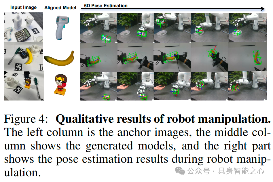 定性结果:图 4 展示了实验过程,左列为锚点图像,中列为生成的 3D 模型,右列为机器人抓取时的位姿估计结果,可见生成的模型与真实物体纹理、结构高度一致,估计的位姿能精准指导机械臂抓取(如抓取芥末瓶时,灵巧手的指尖位置与物体轮廓匹配);