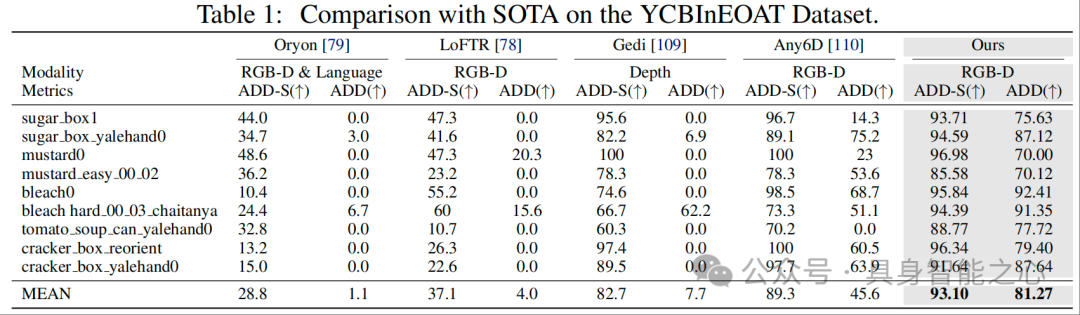 整体优势:OnePoseViaGen 平均 ADD 达 81.27%,平均 ADD-S 达 93.10%,远超其他方法 —— 例如 Oryon 平均 ADD 仅 1.1%、LoFTR 仅 4.0%、Any6D 仅 45.6%,即使是表现较好的 Gedi,平均 ADD 也仅 7.7%;