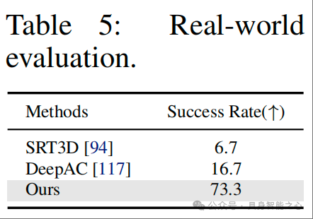 OnePoseViaGen 的整体成功 rate 达 73.3%,远超基线方法 SRT3D(6.7%)和 DeepAC(16.7%)—— 基线方法因位姿估计误差大(如抓取时手部遮挡导致位姿偏移),常出现 “抓空” 或 “放置倾斜”;
