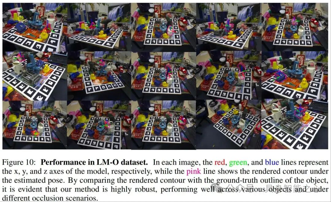 图 10(LM-O 定性结果)直观展示了性能:红色 / 绿色 / 蓝色线为模型坐标轴,粉色线为估计位姿的渲染轮廓,可见即使物体被严重遮挡(如 “driller” 被盒子遮挡),渲染轮廓仍与真实物体边缘高度重合,验证了方法的抗遮挡能力。