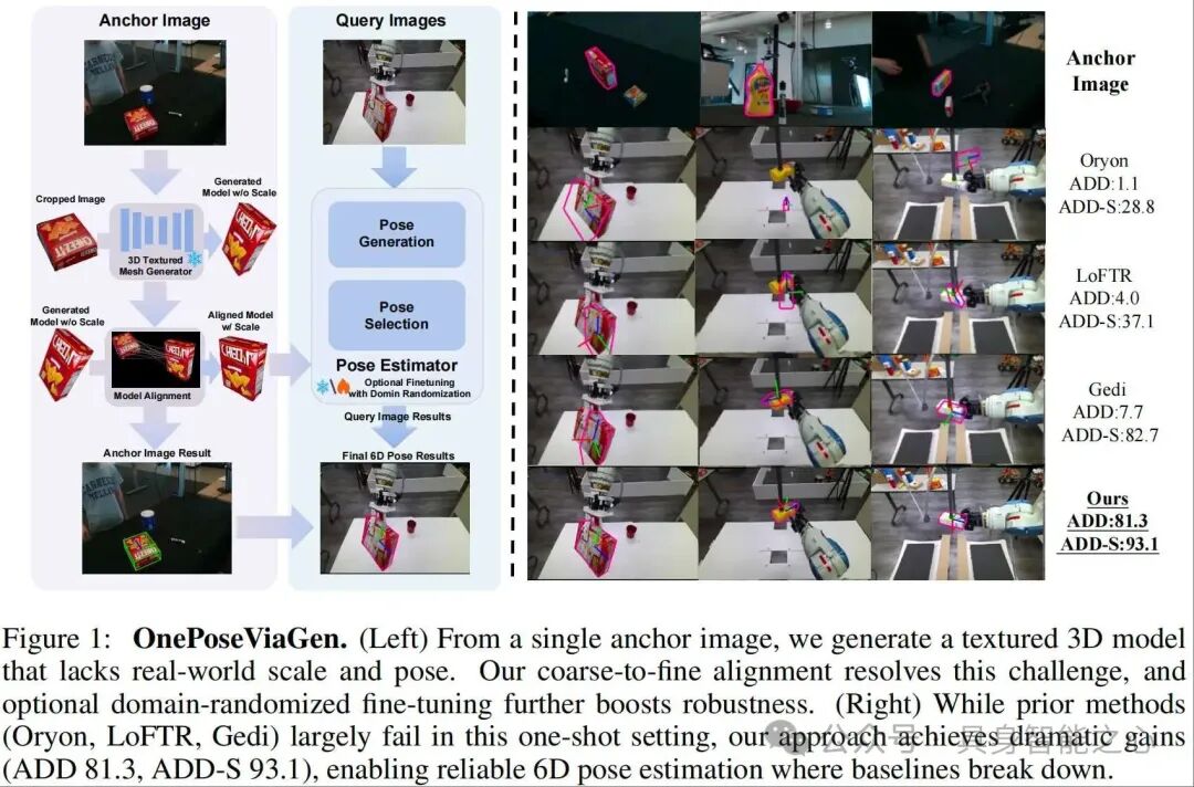 基于此背景,由北京智源研究院、清华大学、南洋理工大学等机构联合提出的 OnePoseViaGen,给出了一套颠覆性解决方案:它不需要预设 3D 模型,仅凭一张参考图,就能通过 “单视图 3D 生成 + 粗精对齐 + 文本引导域随机化” 的组合拳,完成未知物体的 6D 位姿估计。在 YCBInEOAT、LM-O 等权威 benchmarks 上,它的表现远超 Oryon、Any6D 等主流方法,甚至能支撑机械臂完成灵巧抓取,成功率达到 73.3%—— 这无疑为具身智能补上了 “空间感知” 的关键一块。
