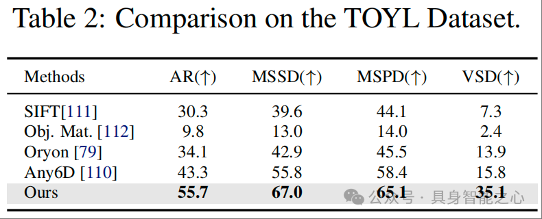 TOYL 数据集聚焦复杂光照与远距离挑战,表 2 显示 OnePoseViaGen 在所有 BOP 指标上均领先: