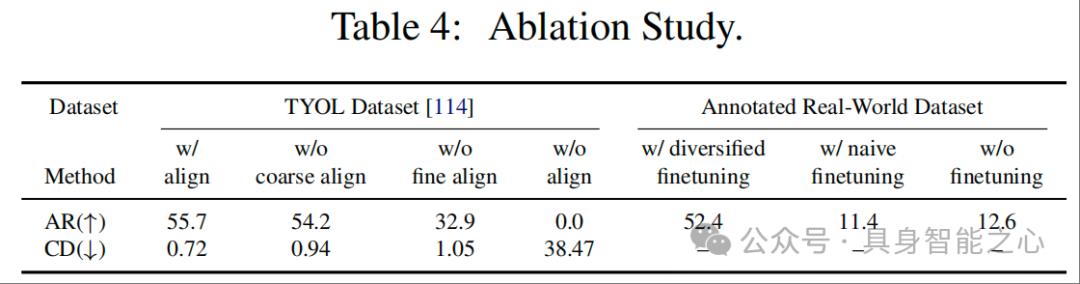消融实验聚焦 “粗到精对齐” 和 “生成式域随机化微调” 两大核心模块,通过 “移除模块→观察性能变化”,量化各模块的必要性,结果如表 4 所示,充分验证了粗到精对齐的必要性以及生成式域随机化微调是 “提升方法鲁棒性的关键”。