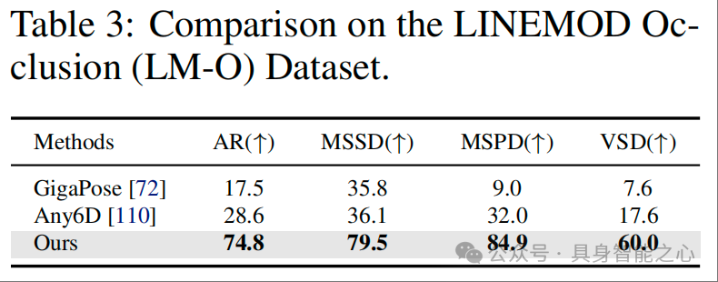 整体 AR:达 74.8%,远超 GigaPose(17.5%)和 Any6D(28.6%),即使是无纹理的 “can”“holepunch” 等物体,AR 也能达到 87.3%、79.2%;