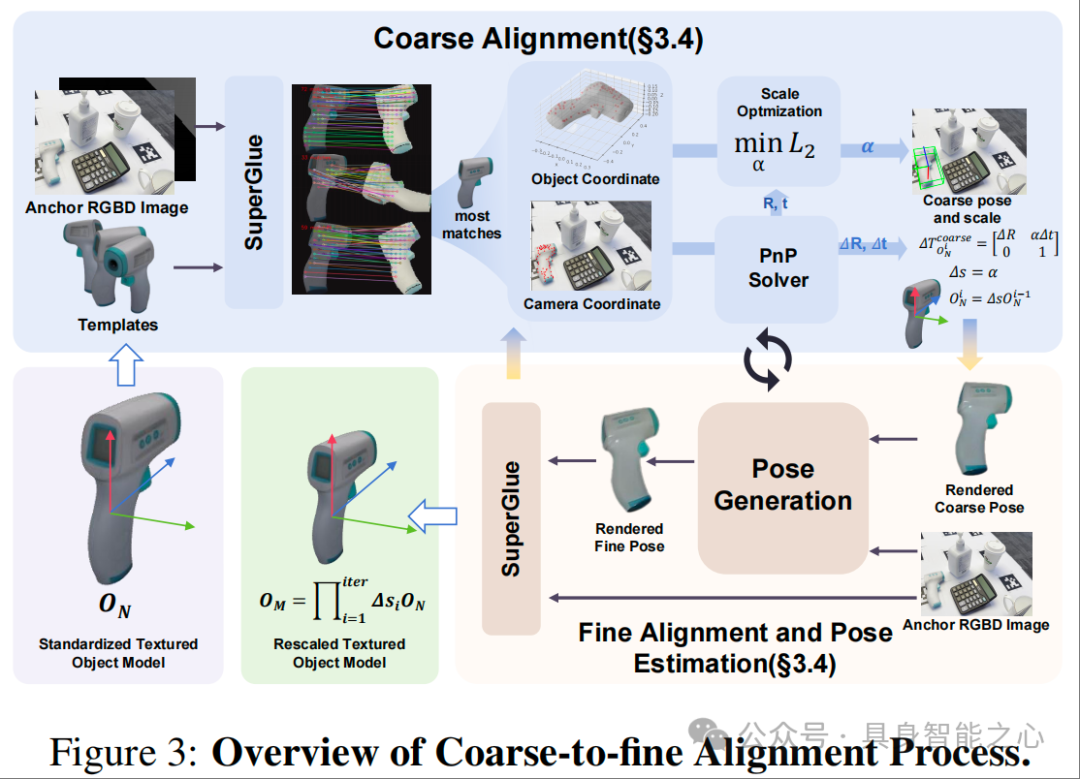 拿到标准化模型 后,核心矛盾转为 “如何将归一化模型与真实世界对齐”。由于 的尺度和位姿与 中的真实物体不匹配,直接使用会导致严重的位姿估计误差,因此设计了 “粗到精” 的两步对齐策略,确保精度逐步提升。