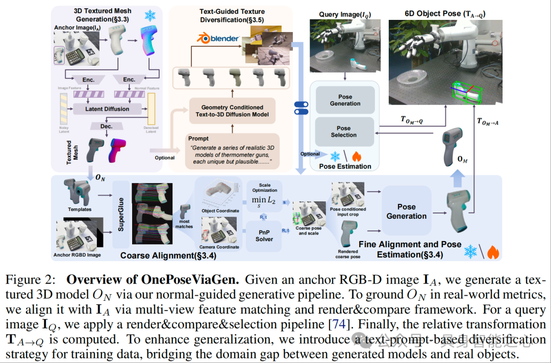 下面我们对 OnePoseViaGen的关键研究成果进行详细解读,整体流程如图 2 所示。遵循 “先解决 3D 模型缺失问题,再校准真实尺度与位姿,最后缩小域差距提升鲁棒性” 的递进逻辑,逐步突破单样本 6D 位姿估计的三大核心挑战,整体流程环环相扣,每个步骤的输出均为下一步的关键输入。