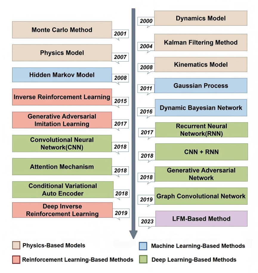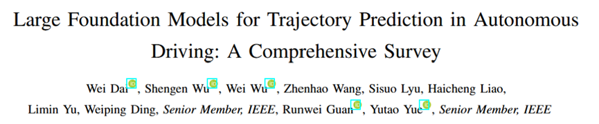 这篇综述探讨了将大语言模型(LLMs)和多模态大语言模型(MLLMs)等大型基础模型应用于自动驾驶轨迹预测的新范式 。这种方法通过整合语言和情境知识,使自动驾驶系统能更深入地理解复杂的交通场景,从而提升安全性和效率。文章回顾了从传统方法到由LFM引入的范式转变,涵盖了车辆和行人的预测任务、常用的评估指标和相关数据集 。它详细介绍了LLM的三种关键应用方法:轨迹-语言映射、多模态融合和基于约束的推理,这些方法显著提高了预测的可解释性和在长尾场景中的鲁棒性 。尽管LLM有诸多优势,但也面临计算延迟、数据稀缺和真实世界鲁棒性等挑战 。