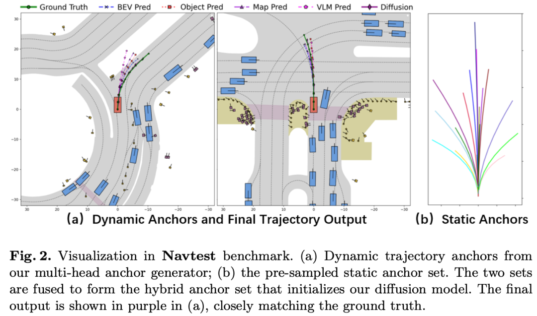该设计具有三个显著优势:(1)效率——从高质量锚点初始化可大幅减少去噪步骤,满足实时规划严苛的延迟要求;(2)性能——通过将生成能力集中于细粒度优化(而非从头生成),模型实现了更高的轨迹精度;(3)鲁棒性——动态锚点(场景特定适配)与静态锚点(通用先验覆盖)之间的协同作用,显著提升了模型在复杂驾驶场景中的鲁棒性和多模态预测性能。