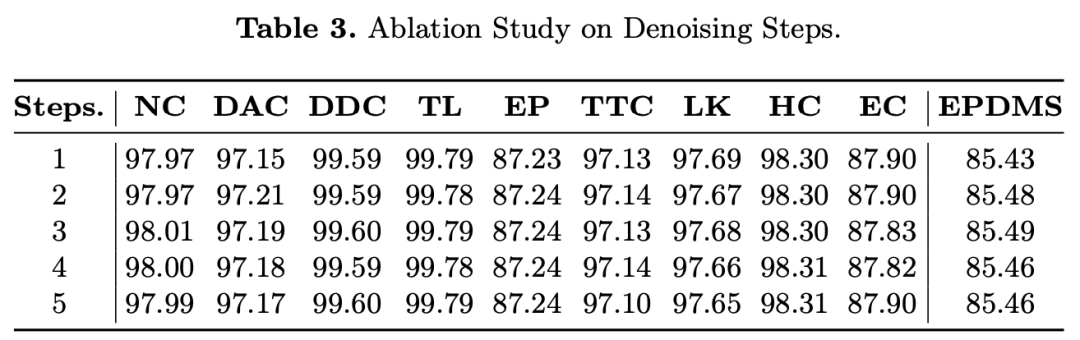 我们还针对截断扩散模型的去噪步骤数量开展了消融实验,表3的结果揭示了一个关键发现:对于从高质量候选锚点初始化的扩散过程而言,更多的去噪步骤并不一定能保证性能的单调提升,反而会不可避免地增加推理延迟。因此,为在规划性能与计算效率之间取得最佳平衡,最终版本的AnchDrive模型选择2步去噪步骤。