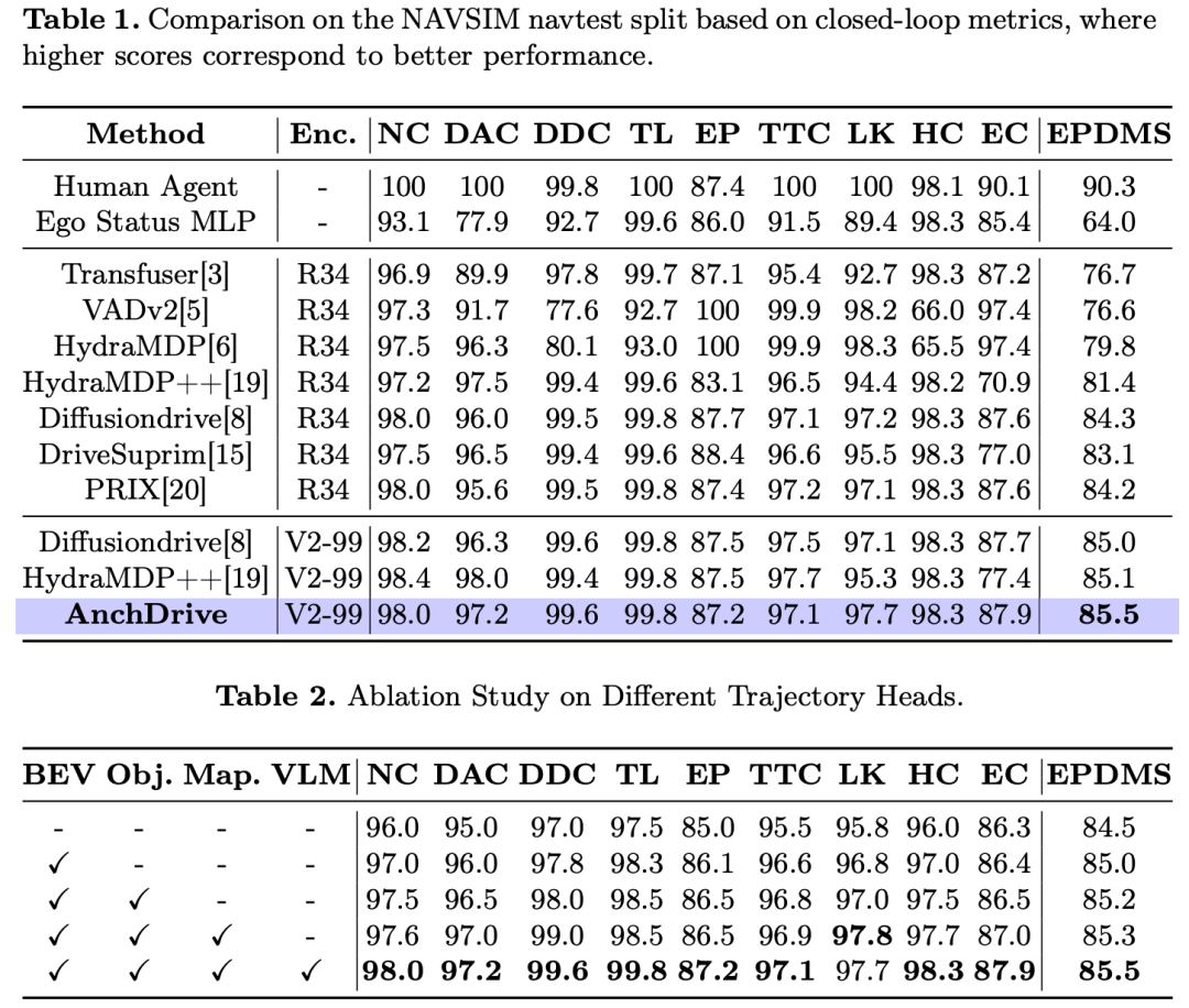 实验结果表明,AnchDrive在具有挑战性的NAVSIM v2基准测试集上达到了当前最佳(SOTA)性能,显著优于依赖大型固定锚点集的现有方法,同时也展现出相对于同类扩散基方法的明显优势,为运动规划领域建立了一种高效且强大的新范式。
