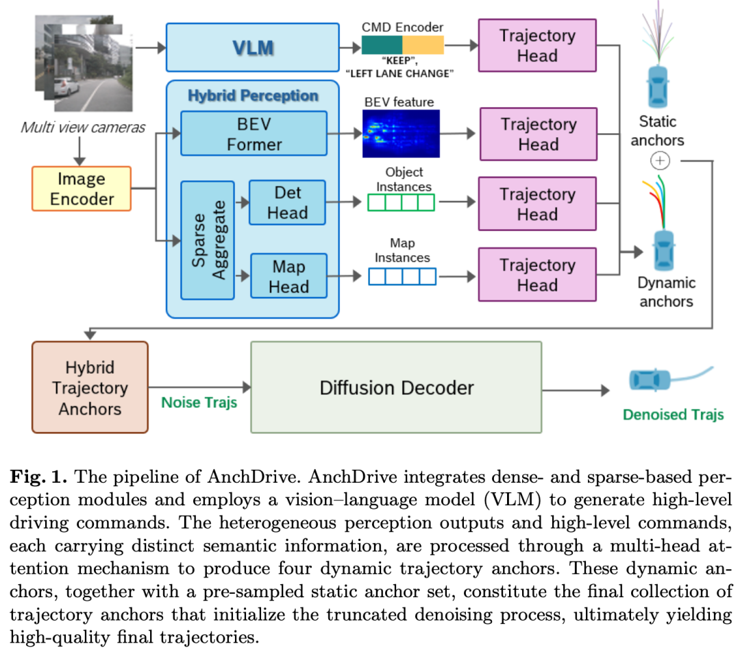 提出AnchDrive这一端到端自动驾驶框架,该框架采用从混合轨迹锚点集初始化的截断扩散过程。这种整合动态锚点与静态锚点的方法,显著提升了初始轨迹质量,并实现了稳健的规划。我们在具有挑战性的Navsim-v2基准测试中验证了其有效性。