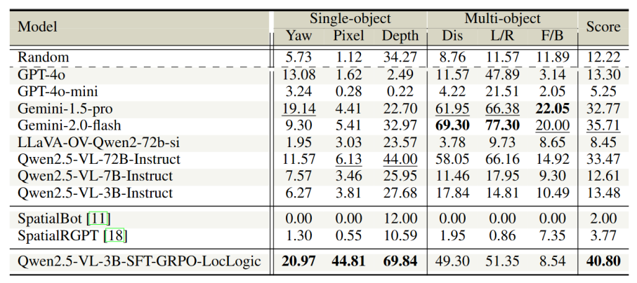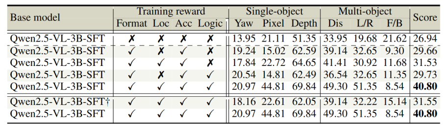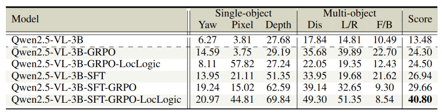 本研究进一步进行了消融实验,以探究奖励机制与训练设计的作用。结果表明,单独加入定位奖励或逻辑奖励提升有限,但当两者结合时,模型的性能有显著提升。这说明定位能力是空间推理的基础,而逻辑监督则进一步增强了推理一致性。