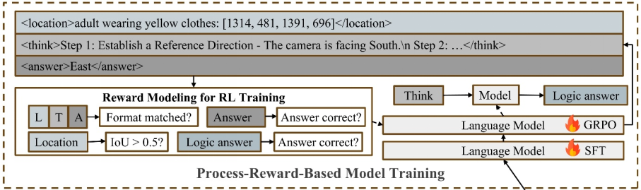 在此基础上,本研究进一步进行强化学习训练。首先通过 SFT 完成模型的冷启动,包括视觉编码器、多模态投影层和语言模型的联合训练。随后,引入基于 GRPO 的强化学习框架,要求模型在每次推理中依次生成目标的边界框、逐步的推理过程以及最终答案。训练中设置了多重奖励机制:若预测框与真实区域的交并比较高,给予定位奖励;若输出符合指定格式,给予格式奖励;若最终答案正确,给予准确率奖励。