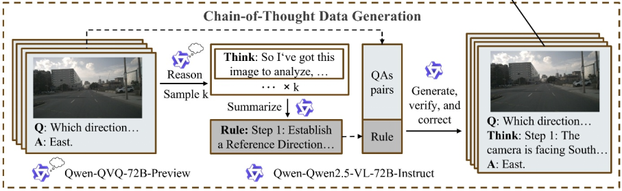 具体而言,先利用视觉推理模型 QVQ 对部分问答对进行推理,再由 Qwen2.5-VL-72B 总结并提炼出可泛化的推理规则,最后结合规则和原始数据生成带有 CoT 标注的新问答数据,并通过模型自校验机制进行筛选与修正。这一过程兼顾效率与质量,解决了直接批量生成推理链成本高、输出冗余不规范,以及单独依赖大模型容易产生幻觉的问题。