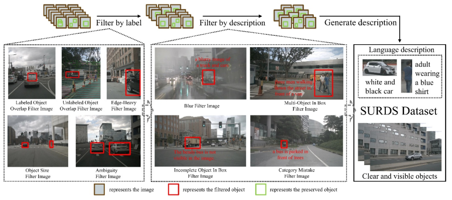 这是一个专为自动驾驶研究设计的大规模公开数据集,包含六个摄像头的全景图像、LiDAR、雷达和GPS/IMU等多模态信息。数据采集于波士顿和新加坡的城市环境,涵盖多种交通状况、天气和昼夜场景,保证了测试的多样性与真实感。 为了确保样本清晰、无歧义,本研究设计了一套多阶段的数据筛选流程:首先剔除被严重遮挡的目标;再去除边界外或尺寸过小的目标;最后利用大模型生成描述,排除语义模糊或噪声样本,如下图所示: