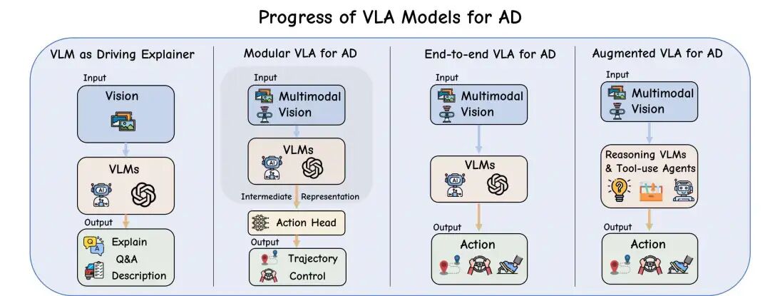 端到端之后,学术界和工业界聚焦的方向是什么?无疑是VLA。VLA提供了类人思考的能力,把车辆决策的过程通过思维链的形式展现出来,从而提供更可靠更安全的自动驾驶能力。自动驾驶VLA目前可以分为模块化VLA、一体化VLA和推理增强VLA三个子领域。