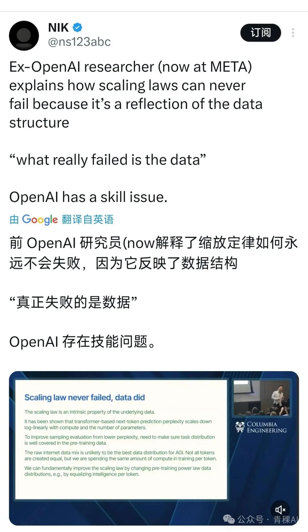 他的大意是:Scaling Laws永远不会失效,是因为数据不足,分布不合理,低价值数据匹配到了等价算力,让模型智力受阻。
