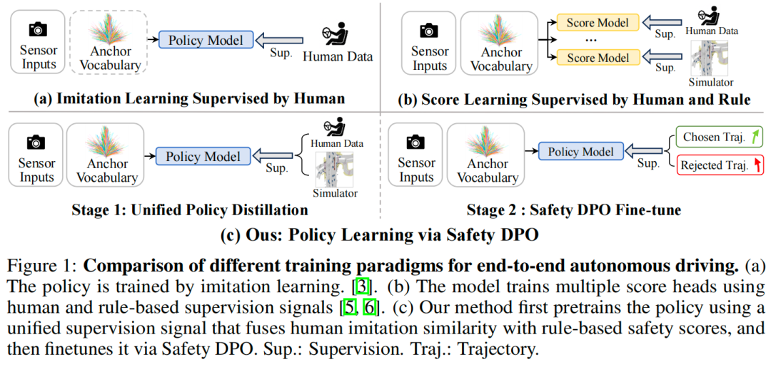 近年来端到端自动驾驶发展很快。与传统的模块化流程不同,端到端方法直接从原始传感器输入预测未来轨迹,既避免了模块间的误差累积,又简化了整个系统的流程。如图1a所示,主流端到端方法通过模仿学习优化。尽管模仿学习能生成符合人类驾驶习惯的行为,但它存在两个关键的安全性问题: