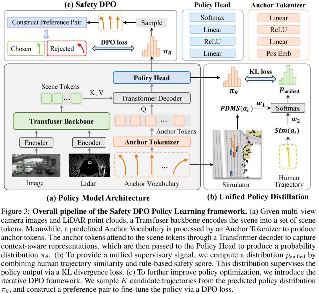 受模仿学习的安全性问题以及基于分数的方法在优化间接性上的局限所启发,本文提出DriveDPO——一种基于安全直接偏好优化(Safety DPO)的策略学习框架。具体而言:
