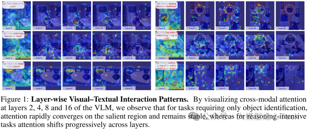 之前的工作普遍观察到在decoder后期视觉 token 的信息贡献显著衰减,但是作者发现,现有算法在每层设置多少裁剪比例时,通常采用固定的策略。这种形式一方面缺乏全局计算budget约束,另一方面需要手工调参以满足目标 token 数或 FLOPs 预算且泛化性有限。对于需要多步推理与动态跨模态交互的任务如 VQA ,固定策略难以适配样本与任务差异。如图中所示,我们的分析显示 token 重要性的层间变化随输入图像与提问问题的难度而变化。