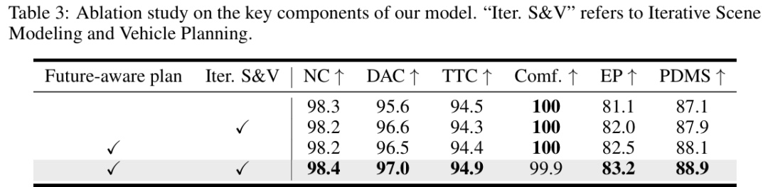 组件有效性(table 3):去掉未来感知规划或迭代优化,PDMS均下降(如两者都去掉时PDMS从88.9降至87.1),说明双向建模和迭代优化是性能提升的关键。