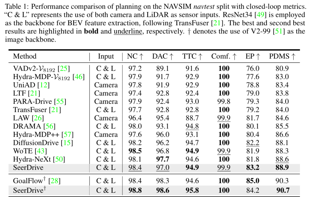 SeerDrive在PDMS分数上达到88.9,超越Hydra-NeXt(88.6)、WoTE(88.3)、DiffusionDrive(88.1)等方法;当采用V2-99骨干网络时,PDMS进一步提升至90.7,超过GoalFlow的90.3,且计算成本更低。