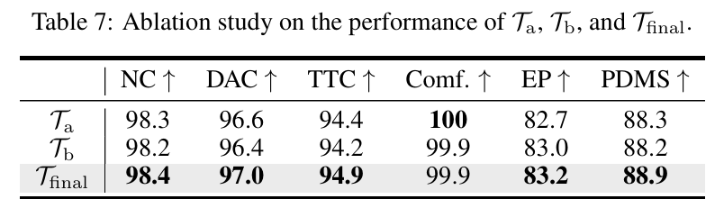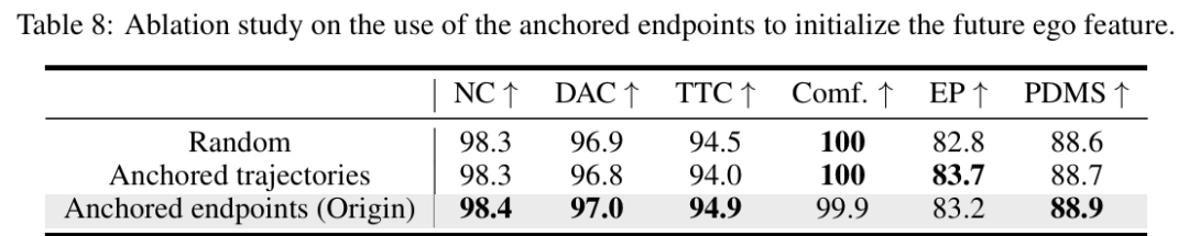 轨迹模态与初始化(table 7、table 8): 的PDMS(88.9)显著高于 (88.3)和 (88.2),证明融合当前与未来信息的价值;用锚定端点初始化未来ego特征的效果最优(PDMS=88.9),优于随机初始化(88.6)或锚定轨迹初始化(88.7)。