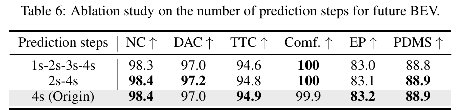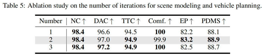 迭代次数与未来BEV预测步(table 5、table 6):迭代2次时性能最优(PDMS=88.9),迭代1次或3次均导致性能下降;仅预测最终规划步的未来BEV(4s)即可满足需求,增加中间步(如1s-2s-3s-4s)无性能提升但增加复杂度。