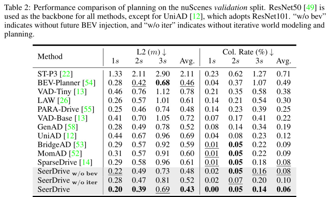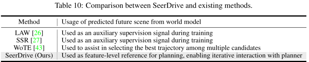 联合世界建模与规划:WoTE仅用世界模型从候选轨迹中选最优,无特征级交互;SeerDrive则将未来BEV作为规划的特征级输入,并通过迭代反馈优化,互动更深入(table 10)。