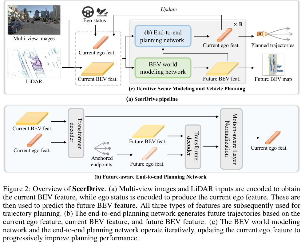SeerDrive的整体 pipeline 包含特征编码、未来BEV世界建模、未来感知规划、迭代优化四大模块,核心是通过“预测未来场景→指导规划→反馈优化场景”的闭环,实现双向交互。