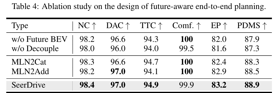 未来感知规划设计(table 4):去掉未来BEV注入(PDMS=87.9)、解耦策略(PDMS=87.3)或MLN(改用拼接/相加,PDMS=88.3/88.5),性能均低于完整设计,验证了解耦策略和MLN的重要性。