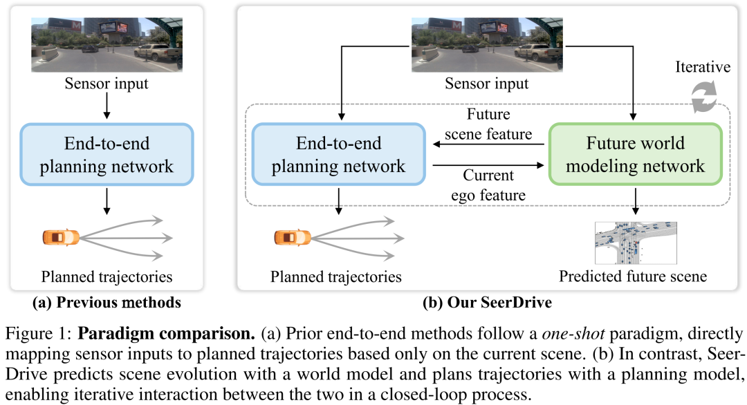 为解决上述问题,复旦和上海创智学院提出SeerDrive,借鉴“世界模型(world models)”的思想,提出轨迹规划与场景演化的双向建模范式:通过预测未来BEV表示捕捉场景动态,同时让规划结果反馈给场景预测的优化,形成闭环迭代(图1),最终实现更具适应性的决策。