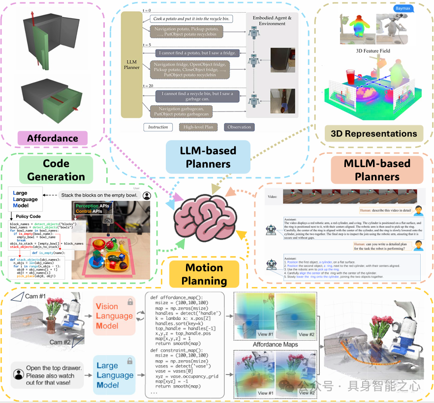 我们将高层规划从传统的任务调度扩展至语言、代码、运动、可供性(affordance)和3D表示,揭示了其在具身智能中的语义决策作用。