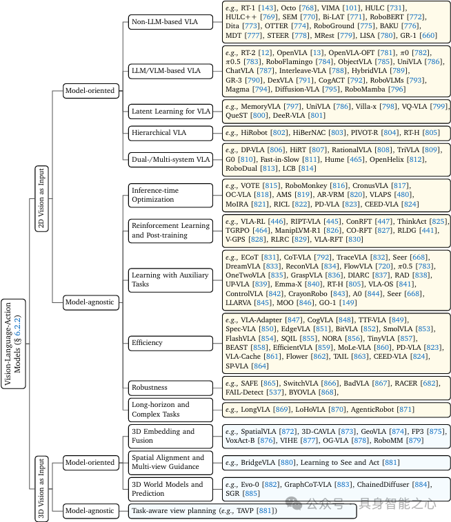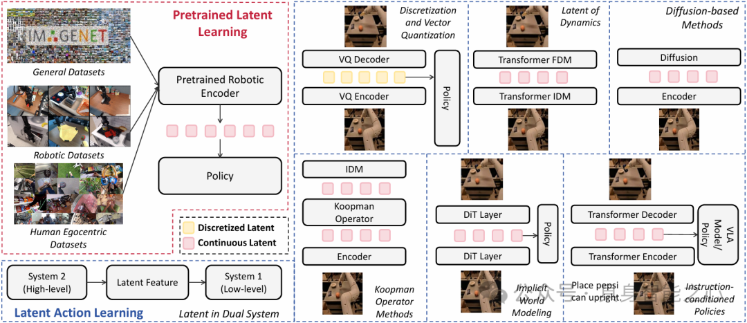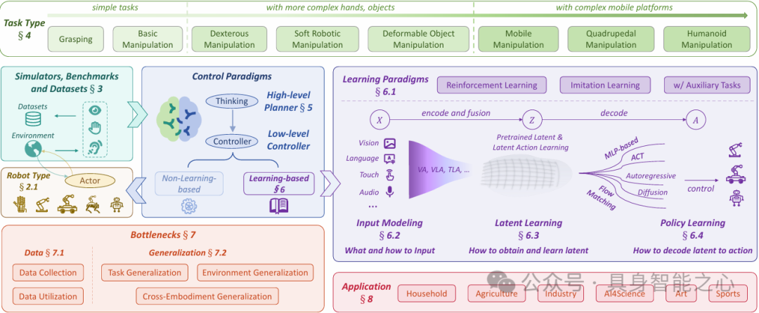 高层规划不仅涵盖任务规划,还包括语言、代码、运动、可供性与三维表示;低层学习控制则提出了一种基于训练范式的新分类,包含学习策略、输入建模、潜表征学习和策略学习四个维度,构建了理解操作方法的统一框架。