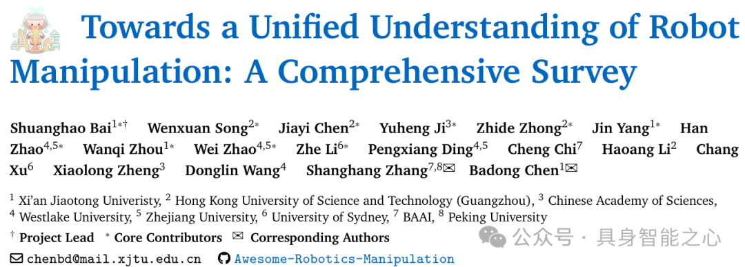 近年来,随着计算机视觉、自然语言处理以及大规模多模态模型的迅速发展,具身智能(Embodied Intelligence)取得了显著进展。在众多关键挑战中,机器人操作(Robot Manipulation)作为具身智能的核心问题之一,因其对感知、规划与控制的无缝整合要求而显得尤为复杂与基础——它决定了智能体能否在多样且非结构化的环境中实现真实交互。