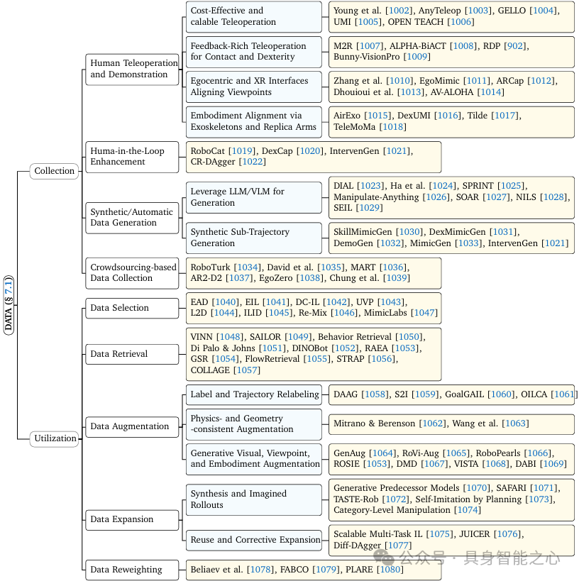 瓶颈分类框架:提出机器人操作研究中的两大核心瓶颈——数据采集与利用、泛化,并总结了相应的研究进展与解决思路。