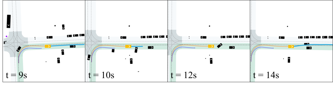 Flow Planner在nuPlan的闭环测试中展现出充分的环境理解能力,能够在与周车、行人的复杂博弈场景中展现出灵活的轨迹规划与生成能力:无论是路口人行横道,还是路边他车无保护驶出,Flow Planner都能够准确判断其他交通参与者的行为意图,并作出快速精准的反应。
