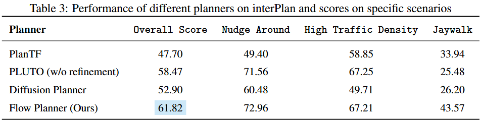 Flow Planner在nuPlan与interPlan两个闭环基准上均取得SOTA级表现,展示了其在复杂交互建模与多场景适应性方面的强大潜力。